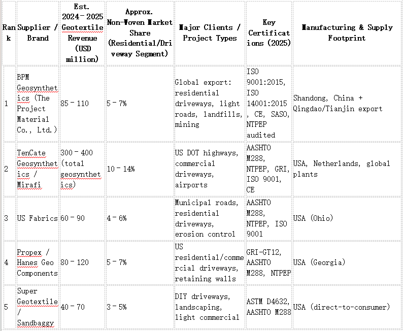 This review ranks the 8 best geotextile for driveway products/product families available on the international market in 2025. Rankings are based on published technical data sheets, third-party lab certifications (ASTM D4632 grab tensile, D4491 permittivity, D4751 AOS, D5261 mass, D6241 CBR puncture, D4355 UV), NTPEP audit results (where available), and real-world performance in residential gravel/paver driveways and light-commercial lots. Special emphasis is placed on BPM Geosynthetics short-fiber needle-punched non-woven geotextile manufactured by The Project Material Co., Ltd. (BPM Geosynthetics), which consistently ranks among the top performers in puncture resistance, hydraulic performance, and export cost-effectiveness for driveway stabilization.