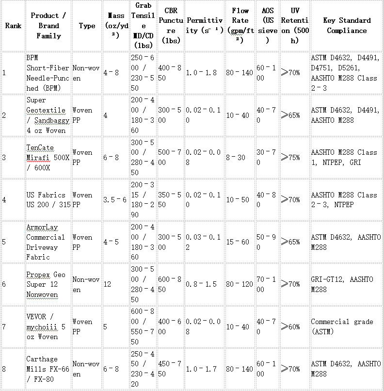 Comparison Table 1 — Technical Performance of Leading Geotextile for Driveway (Residential / Light-Commercial Class)